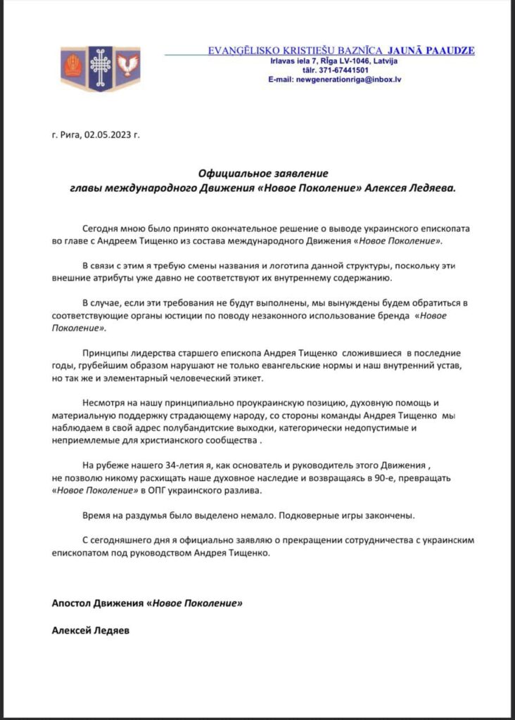 Алексей Ледяев, глава международного движения «Новое Поколение», опубликовал официальное заявление, в котором раскритиковал нормы лидерства епископа Андрея Тищенко, а также подчеркнул, что не позволит превращать «Новое Поколение» в «ОПГ украинского разлива».